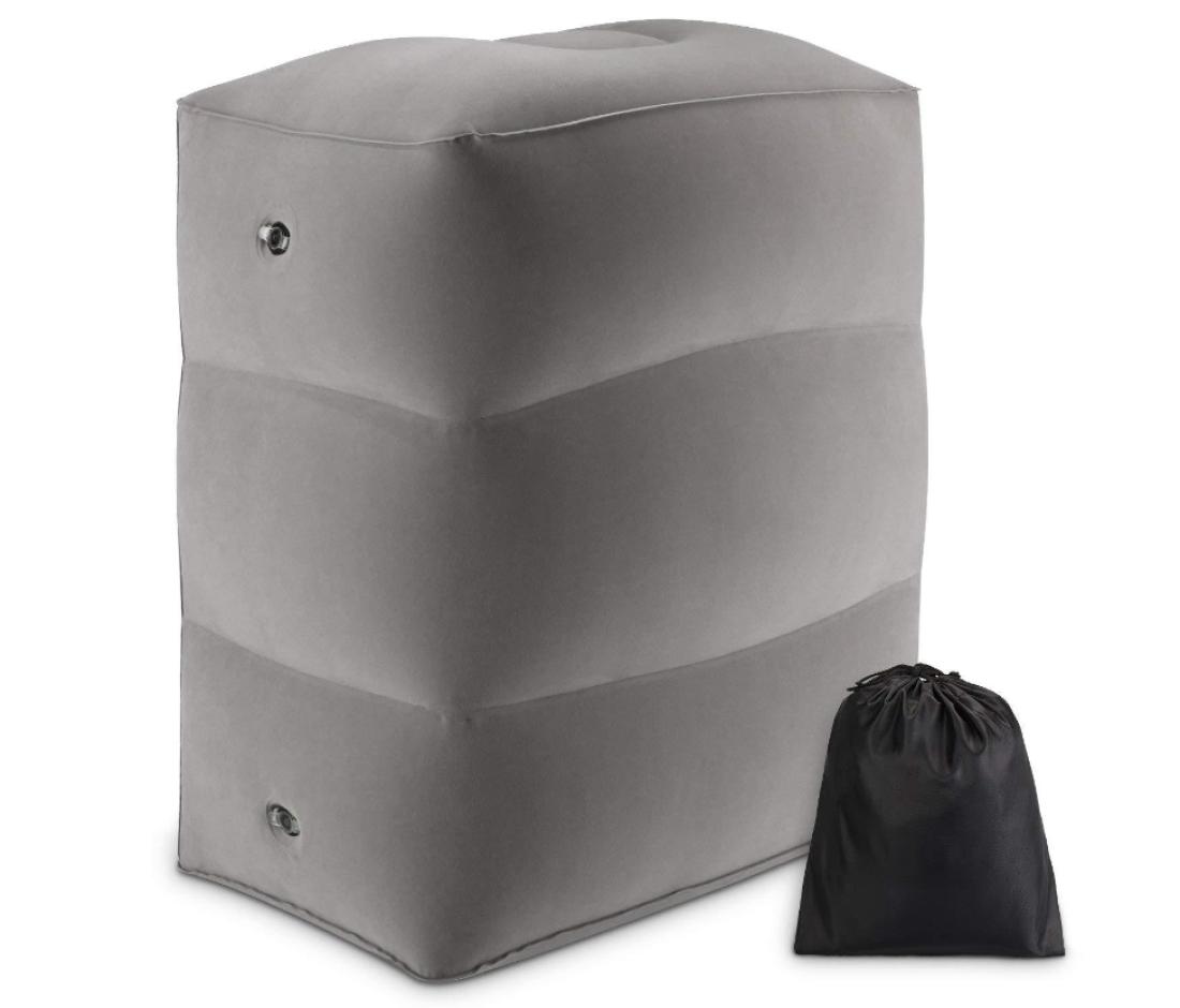Dmuchany podnóżek idealny do długich podróży w kolorze szarym. Rozmiar napełniony (około): 15x10x18 cali (39x24x46 cm). Zmniejszony rozmiar (około): 6 x4 cali (15×10 cm).