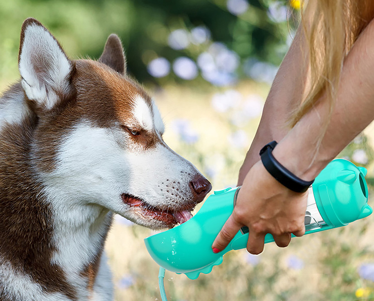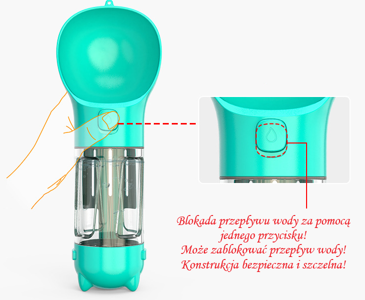 Dzięki kompaktowym wymiarom i paskowi na rękę bidon łatwo zmieści się w plecaku. Wystarczy nacisnąć przycisk, a woda napełni miskę – pies może od razu pić, bez potrzeby używania dodatkowych naczyń.