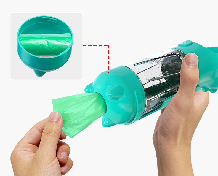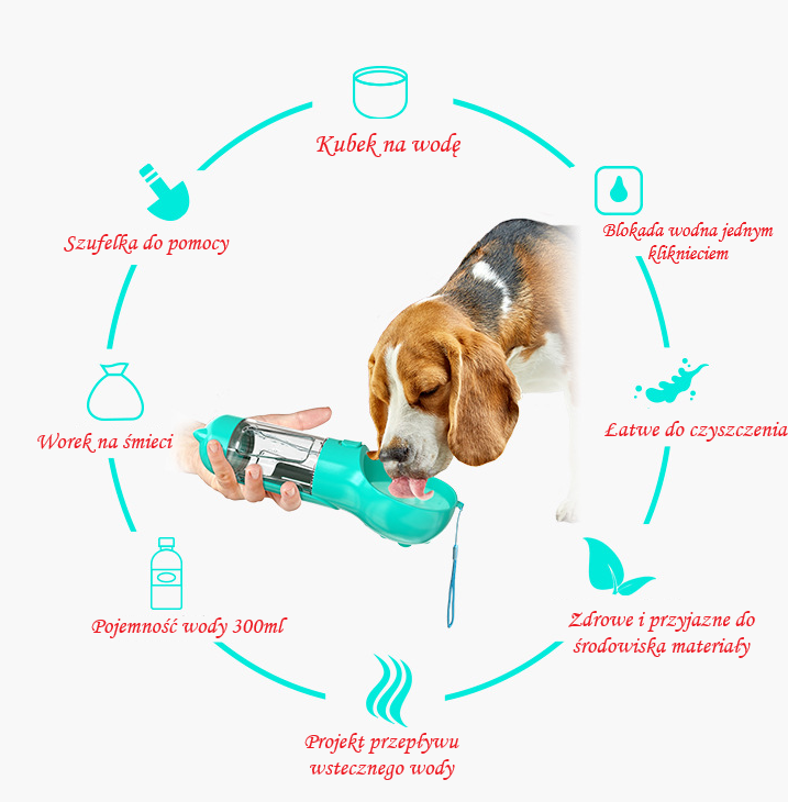 Praktyczny bidon turystyczny 2 w 1 dla psów i kotów – idealny na spacer, podróż lub trening. Umożliwia szybkie podanie świeżej wody i łatwy dostęp do woreczków na odchody, dzięki czemu zawsze masz wszystko pod ręką.