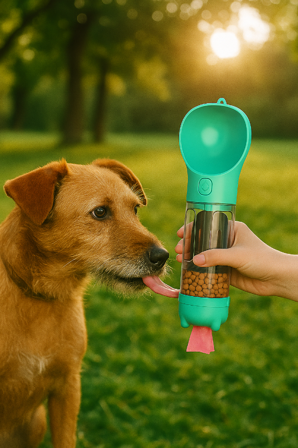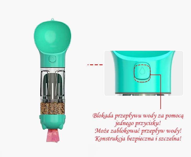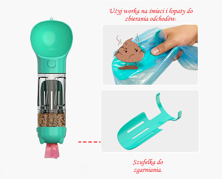 Praktyczny bidon turystyczny 3 w 1 dla psów i kotów – idealny na spacer, podróż lub trening. Umożliwia szybkie podanie świeżej wody i łatwy dostęp do woreczków na odchody jak i na nagrodę dla pupila smaczki, dzięki czemu zawsze masz wszystko pod ręką.