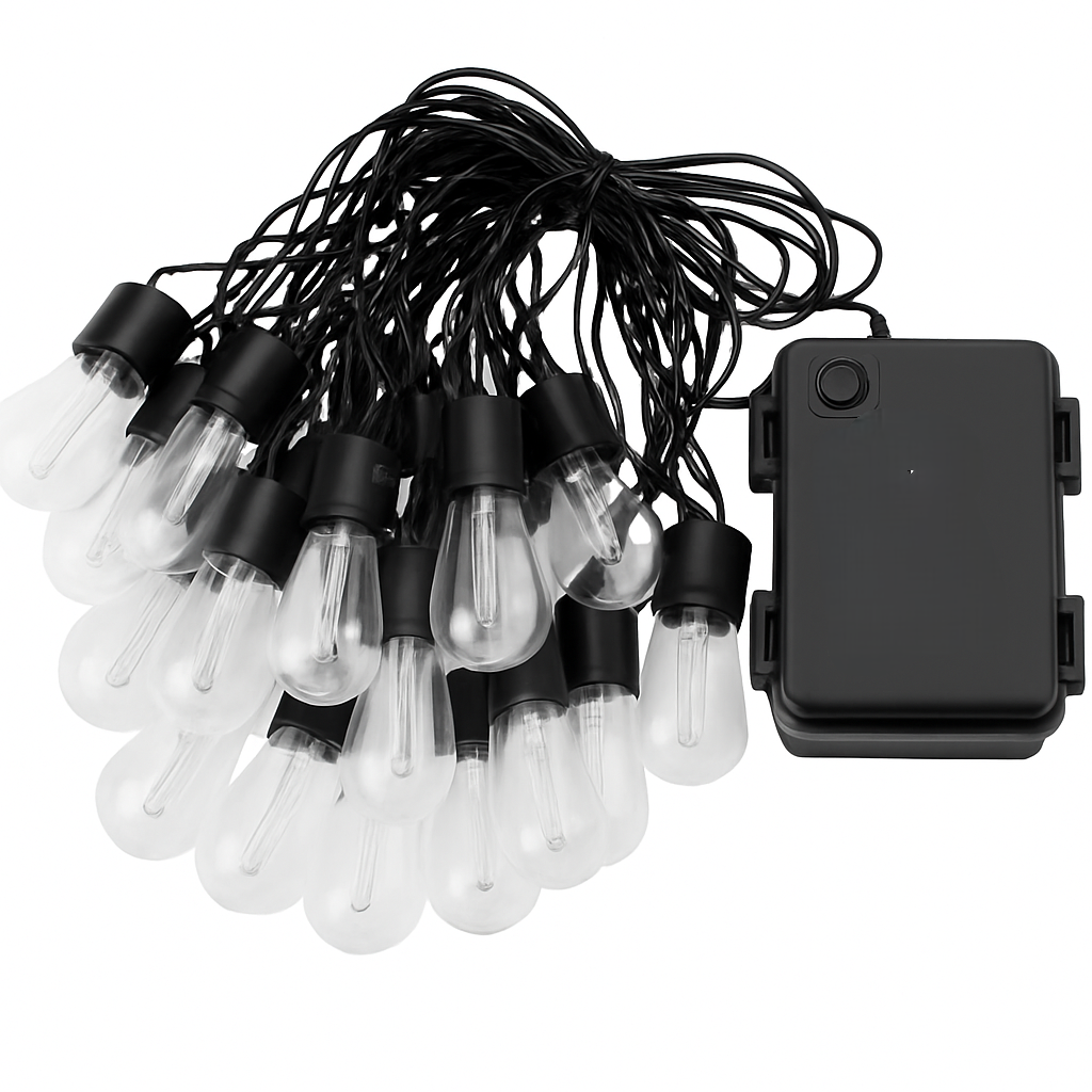 Girlanda tworzy przyjemne, nastrojowe światło, które sprawdza się na balkonie, tarasie, w ogrodzie albo w domu. Ma 6 metrów długości i 20 żarówek w stylu vintage, które świecą ciepłą barwą. Zasilanie na baterie pozwala zawiesić ją w dowolnym miejscu – bez kabli i przedłużaczy.
