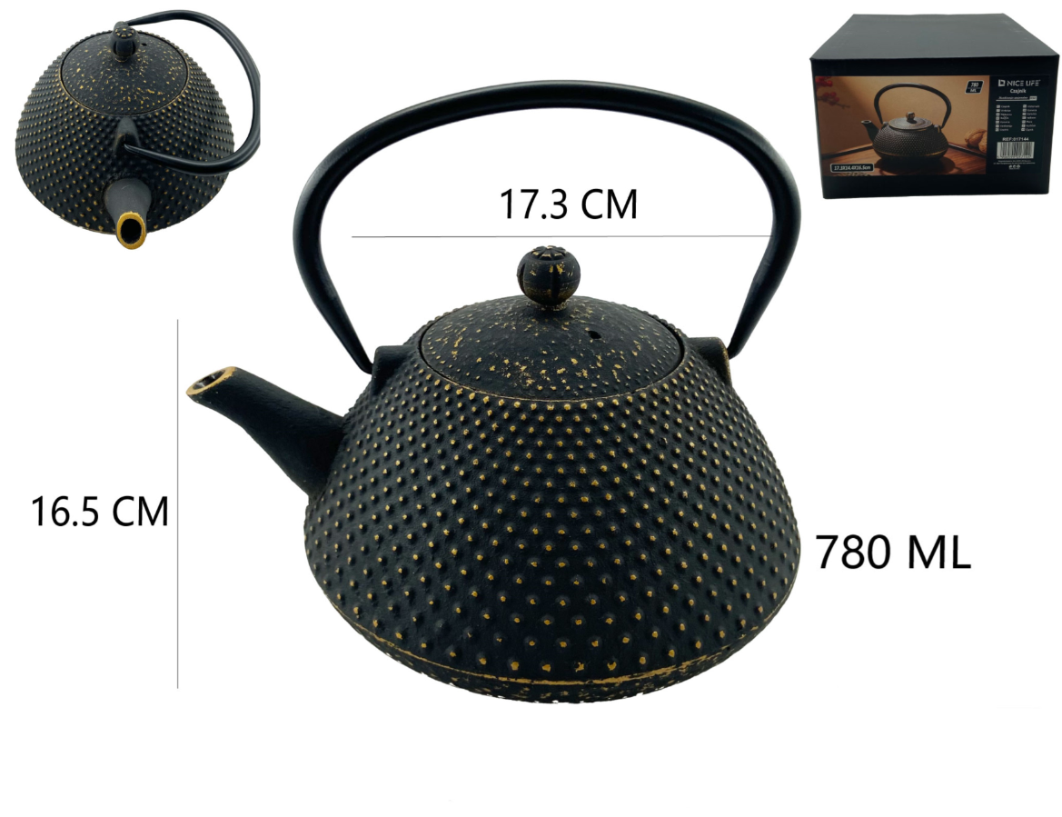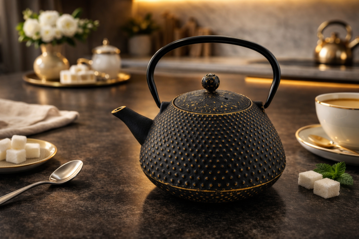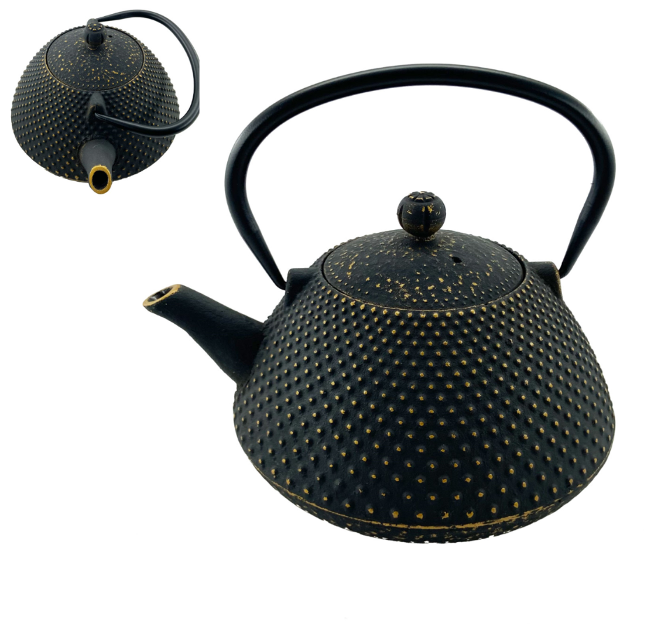 Solidny, żeliwny imbryk inspirowany tradycyjnym japońskim stylem. Czarna powierzchnia z delikatnymi złotymi zdobieniami nadaje mu elegancki charakter, a masywna konstrukcja długo utrzymuje temperaturę naparu.