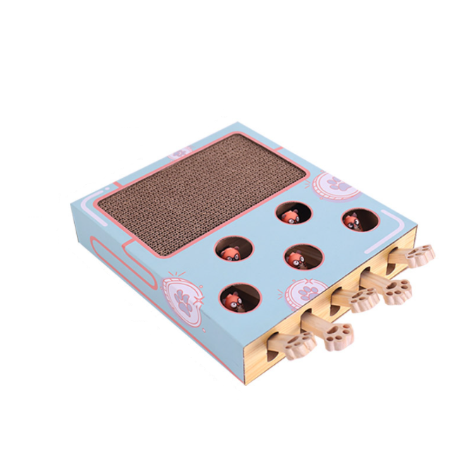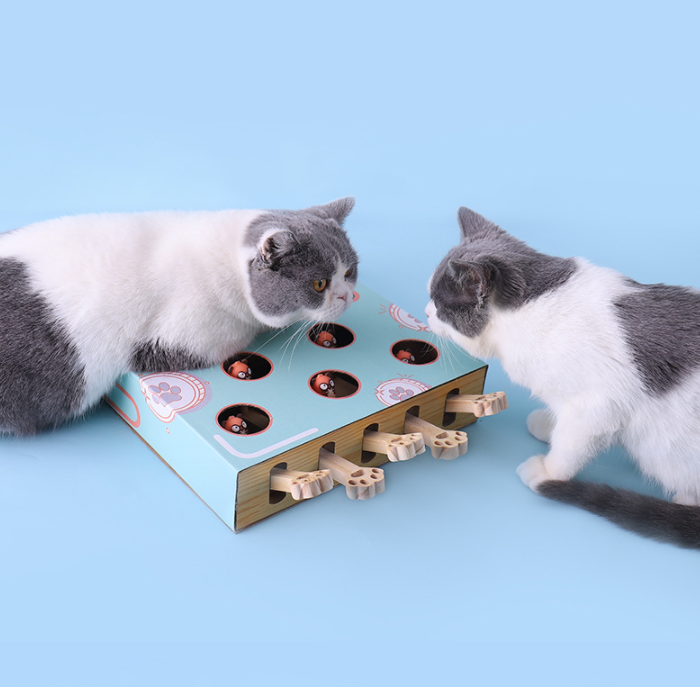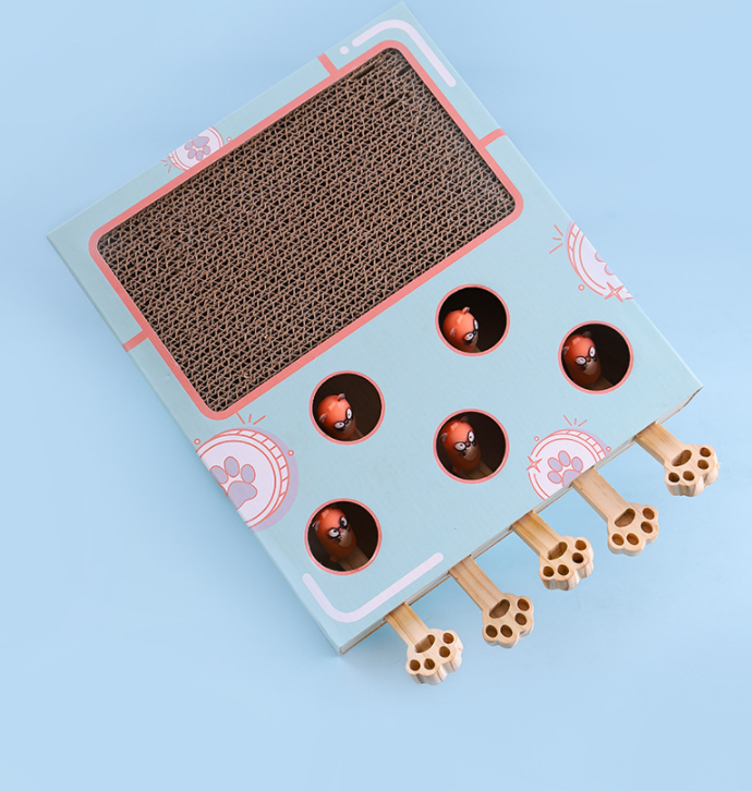 Posiada 5 otworów z których wyskakują małe kotki , poprzez naciśnięcie przez Ciebie lub Twojego pupila drewnianych łapek !