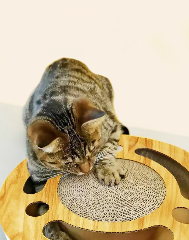 Zabawka i drapak w jednym – kot może ostrzyć pazury na tekturowej powierzchni lub bawić się ukrytą piłką poruszającą się w tunelu.