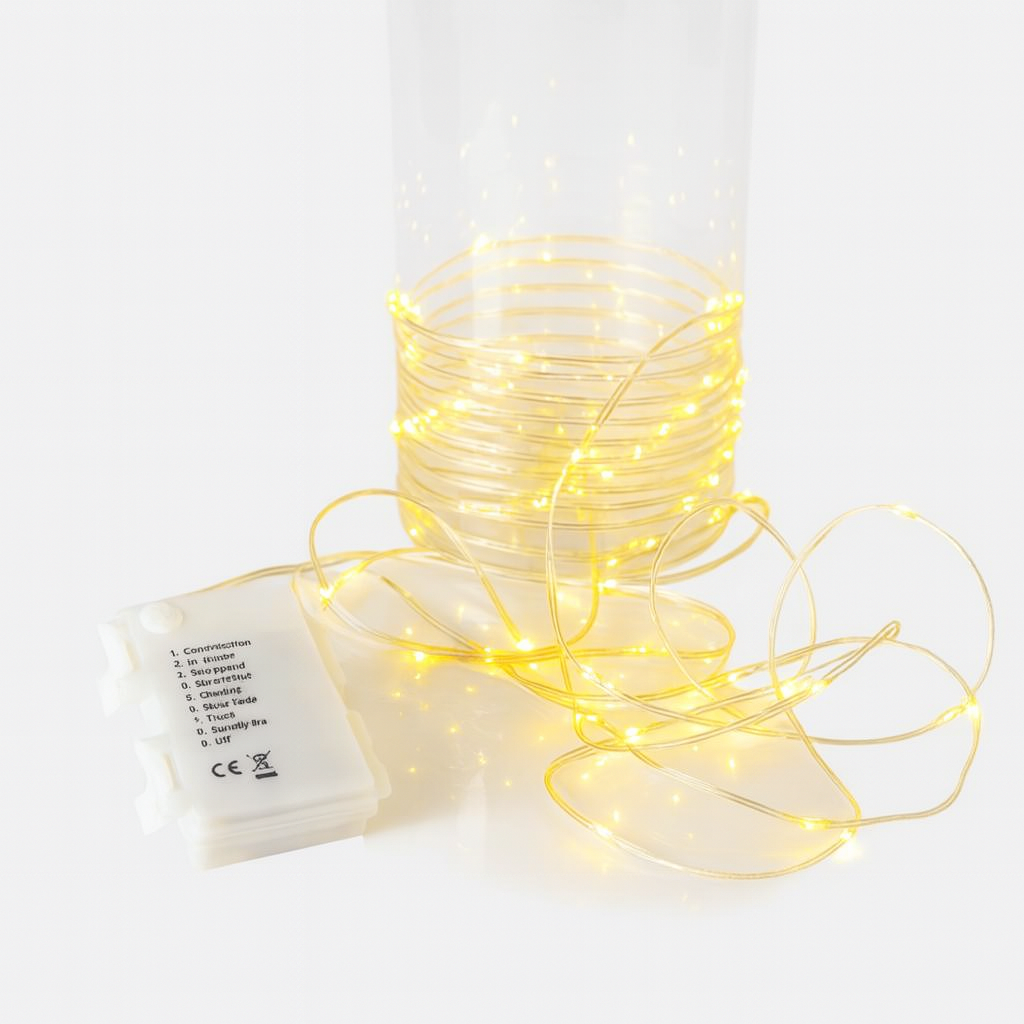 Białe ciepłe lampki LED o długości 8 metrów sprawdzą się w każdym wnętrzu. Dają przyjemne, jasne zimne światło w kilku wariantach świetlnych(2 tryby stały i migający), a dzięki zasilaniu na baterie możesz ułożyć je dokładnie tam, gdzie chcesz – bez szukania gniazdka. Sprawdzą się na półce, w słoiku, na balkonie, choince czy przy dekoracji stołu.