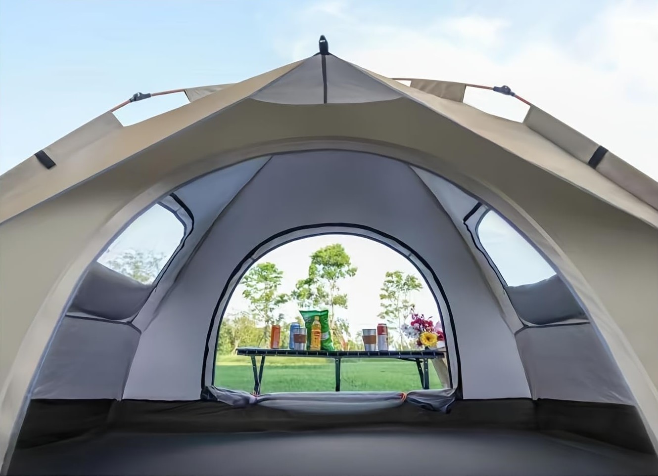 - Doskonała wentylacja – okna i wejście z moskitierą zapewniają cyrkulację powietrza