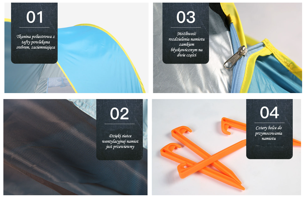 NAMIOT PLAŻOWY SAMOROZKŁADAJĄCY DZIECIĘCY Z BASENEM 70x80x120cm NIEBIESKIIdealny towarzysz letnich przygód Twojego malucha! Praktyczny i lekki namiot samo-rozkładający zapewnia ochronę przed słońcem, wiatrem i lekkim deszczem, tworząc bezpieczną przestrzeń dla dziecka na plaży, w ogrodzie czy podczas pikniku. Wbudowany mini basenik pozwala na zabawę z wodą w upalne dni, bez konieczności opuszczania namiotu.