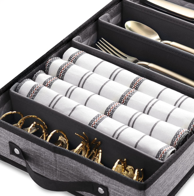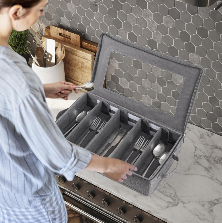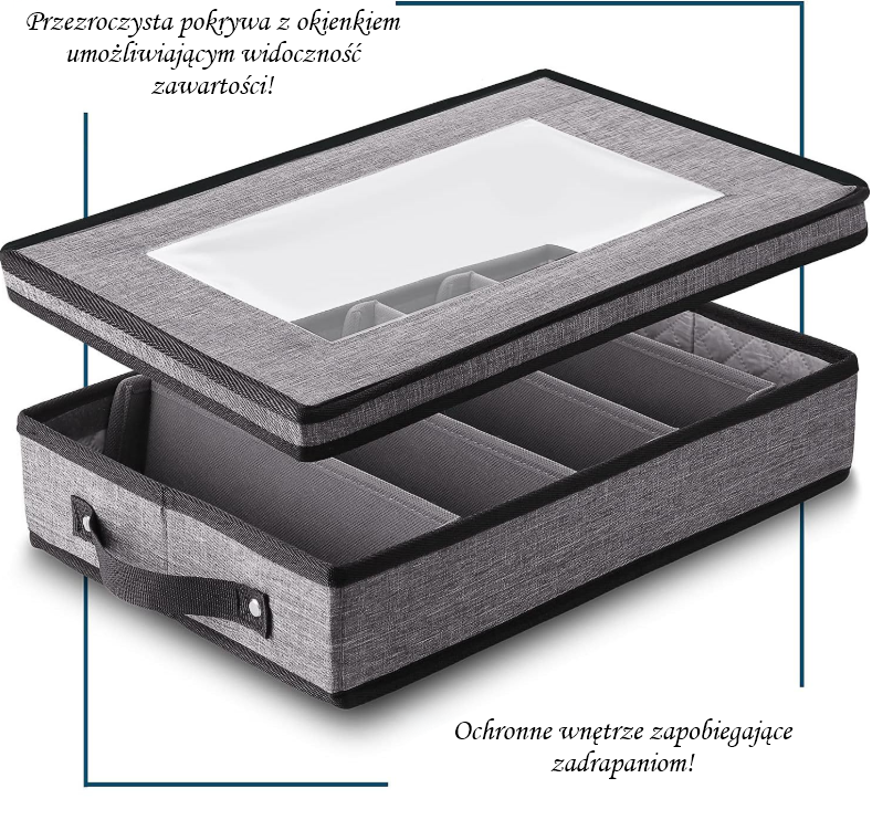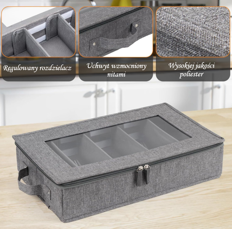 Wnętrze posiada regulowane przegrody, które można dopasować do własnych potrzeb – idealne rozwiązanie zarówno do codziennego użytku, jak i przechowywania serwisu dla gości. Organizer wyposażony jest w uchwyt wzmacniany nitami, co ułatwia przenoszenie.