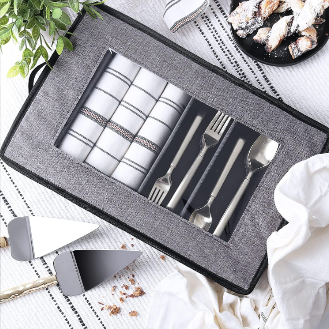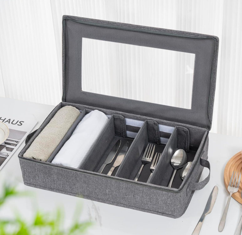 Praktyczny organizer, który pomoże utrzymać porządek w szufladzie lub na stole. Doskonale sprawdzi się do przechowywania kompletu sztućców, serwetek czy akcesoriów stołowych. Wykonany z wytrzymałego poliestru o eleganckiej, szarej strukturze. Pokrywka z przezroczystym okienkiem pozwala łatwo zobaczyć zawartość bez otwierania.