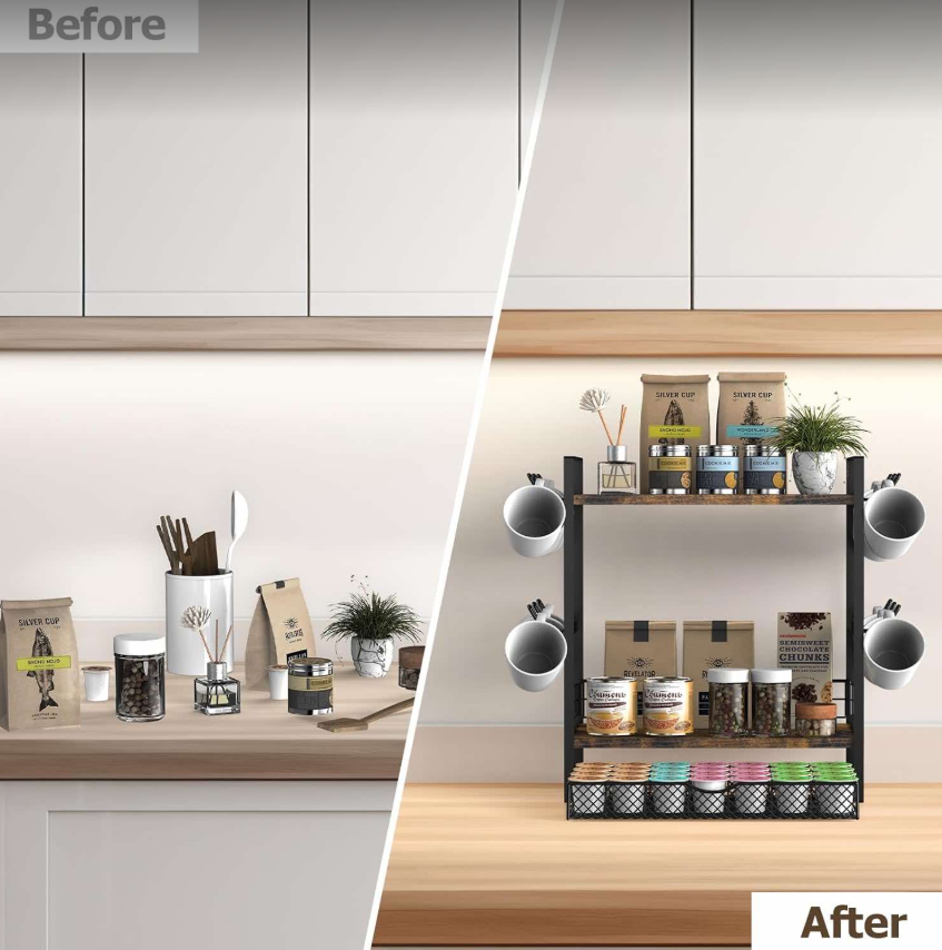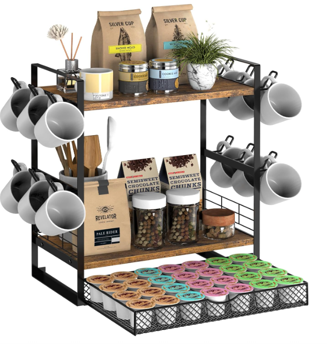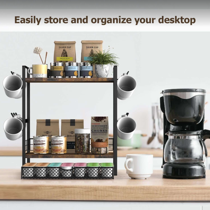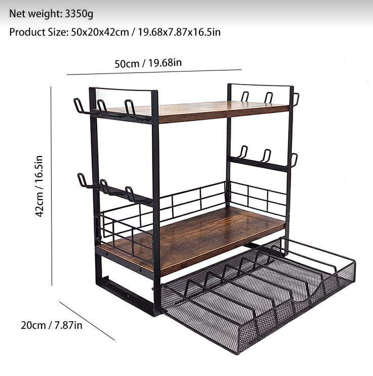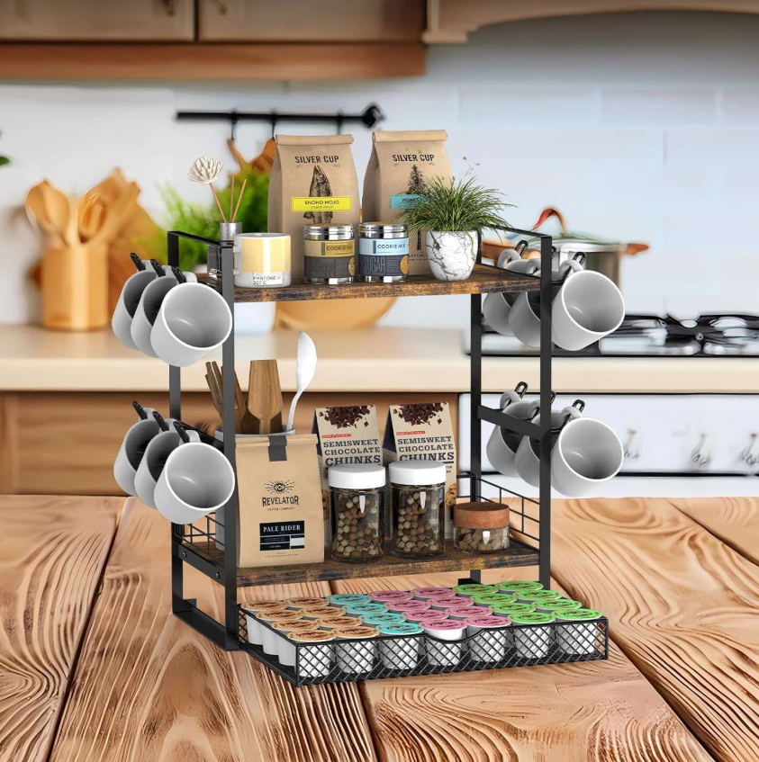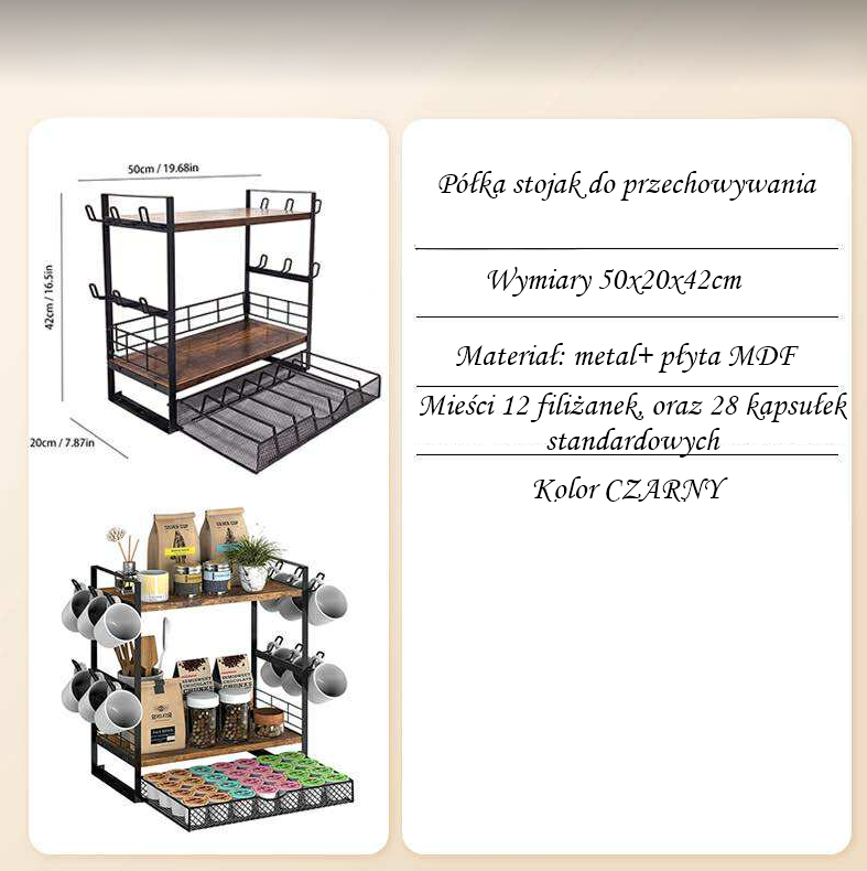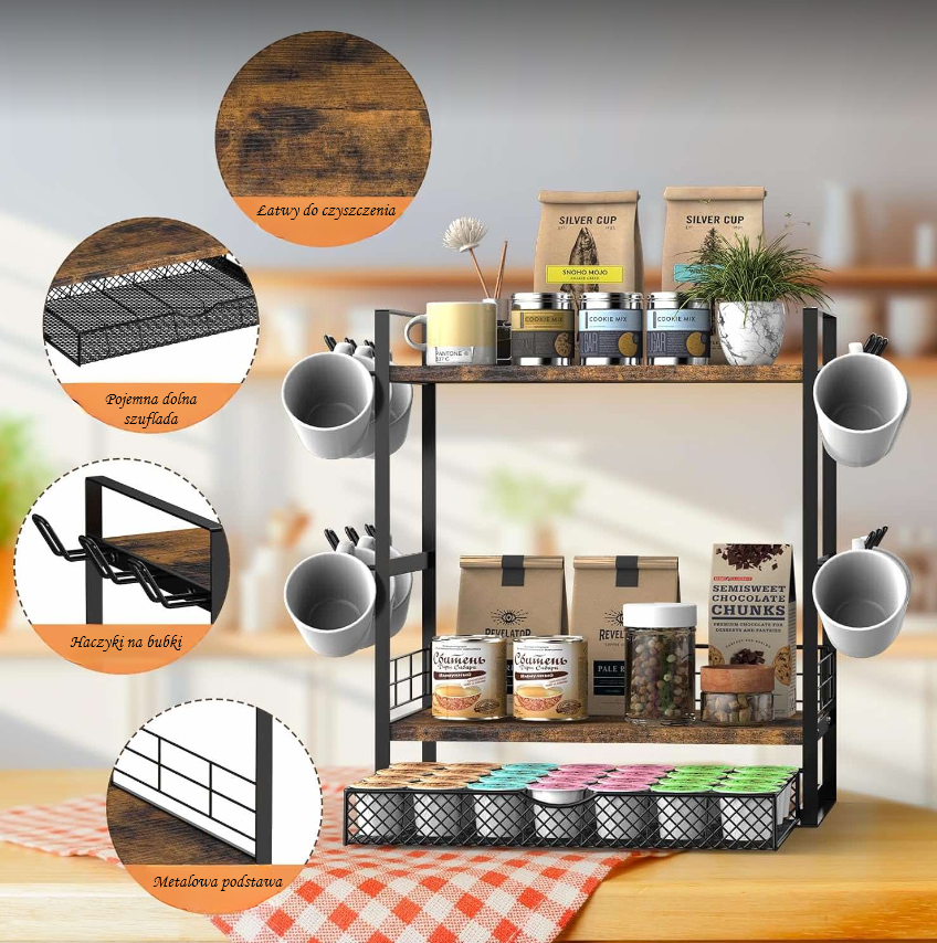 Praktyczny stojak kuchenny, który porządkuje przestrzeń wokół ekspresu do kawy lub na blacie roboczym. Pozwala wygodnie przechowywać filiżanki, kapsułki, kawę, herbatę i drobne akcesoria w jednym miejscu.