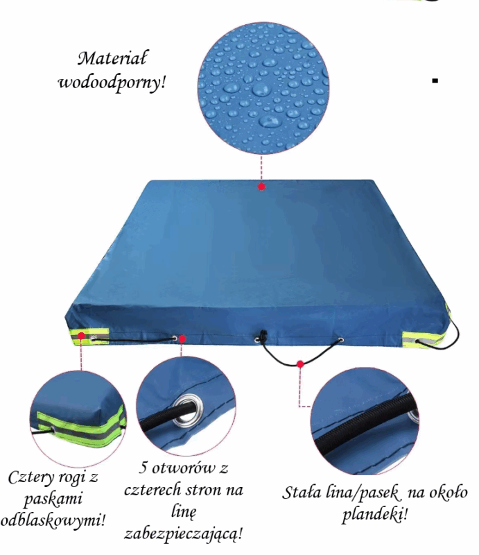 - System mocowania: elastyczna linka z hakami zapewniająca stabilne dopasowanie