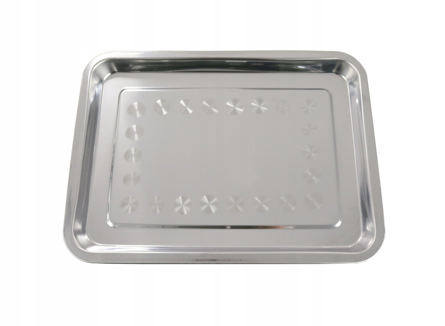 Wielofunkcyjna płytka taca metalowa o wymiarach 32 cm x 22 x 2 cm.