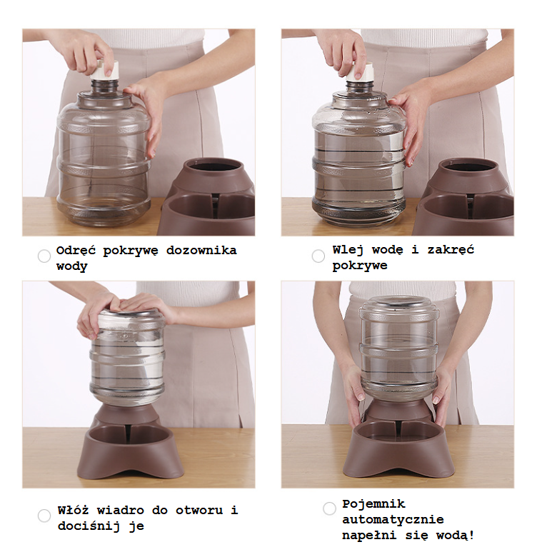 - Automatyczne napełnianie – Woda jest dostarczana w miarę picia przez zwierzę, co zapobiega jej wylewaniu i utrzymuje optymalny poziom.