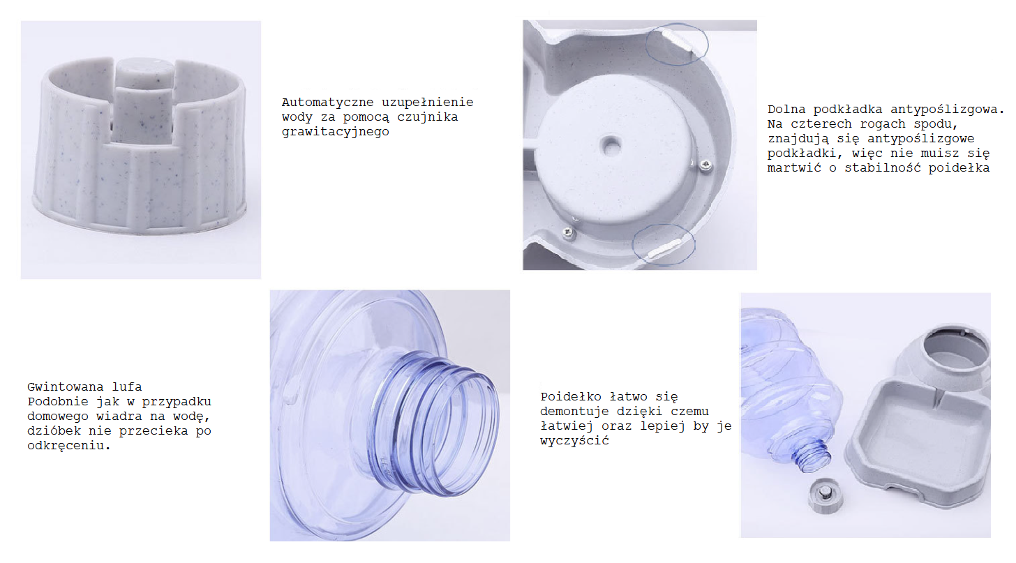 - Automatyczne napełnianie – Woda jest dostarczana w miarę picia przez zwierzę, co zapobiega jej wylewaniu i utrzymuje optymalny poziom.