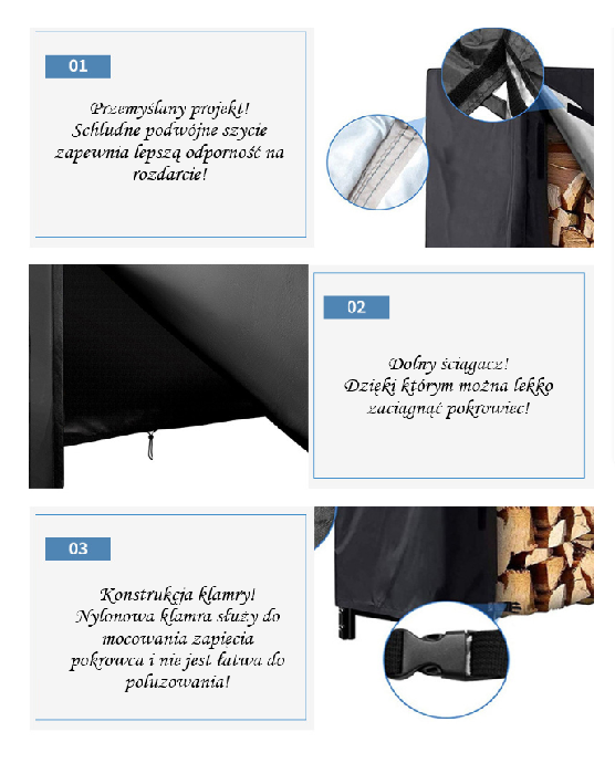 Pokrowiec idealnie sprawdzi się w ogrodzie, na działce czy tarasie – gwarantuje ochronę drewna opałowego przez cały rok. Dzięki niemu nie musisz martwić się o wilgoć ani zabrudzenia, a drewno zawsze pozostanie suche i gotowe do użycia.