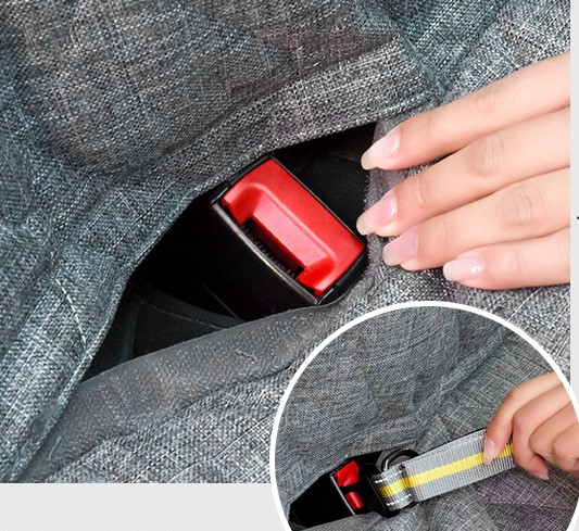 Bezpieczna podróż – w zestawie otwory na pasy bezpieczeństwa i miejsce na przypięcie smyczy.