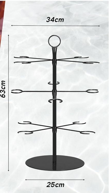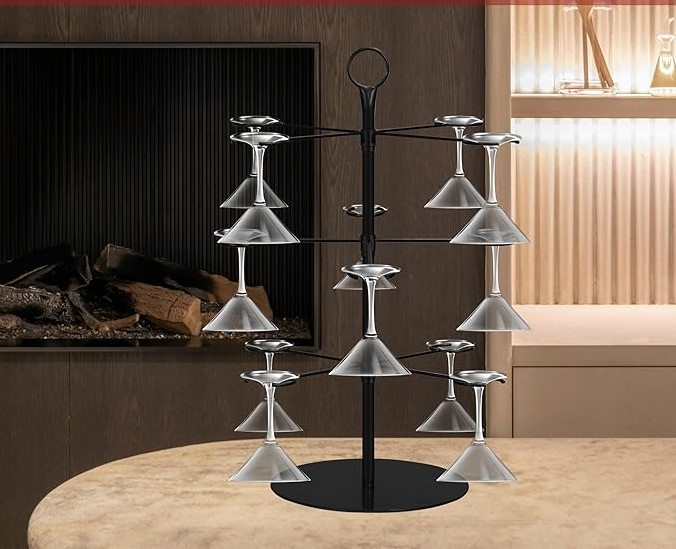 W zestawie znajduje się drzewko o wysokości 63 cm, stojak z trzema poziomami i może pomieścić do 12 kieliszków – idealny do łatwego ustawienia i zaprezentowania kieliszków koktajlowych. (Zawiera tylko stelaż, nie zawiera innych artykułów.