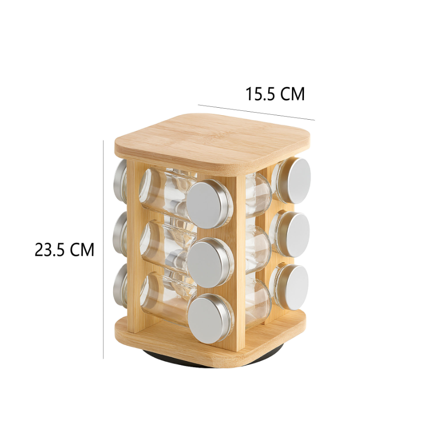 Porządkuje przyprawy i oszczędza miejsce na blacie. Kompaktowa, stabilna konstrukcja z drewnianą podstawą i szklanymi słoiczkami z metalowymi zakrętkami.