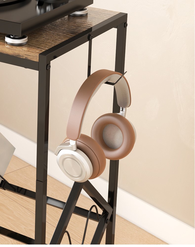 Przedmiotem aukcji jest wielofunkcyjny stojak/stolik na płyty winylowe oraz sprzęt grający, idealny do przechowywania kolekcji winyli, gramofonu, słuchawek i innych akcesoriów audio.