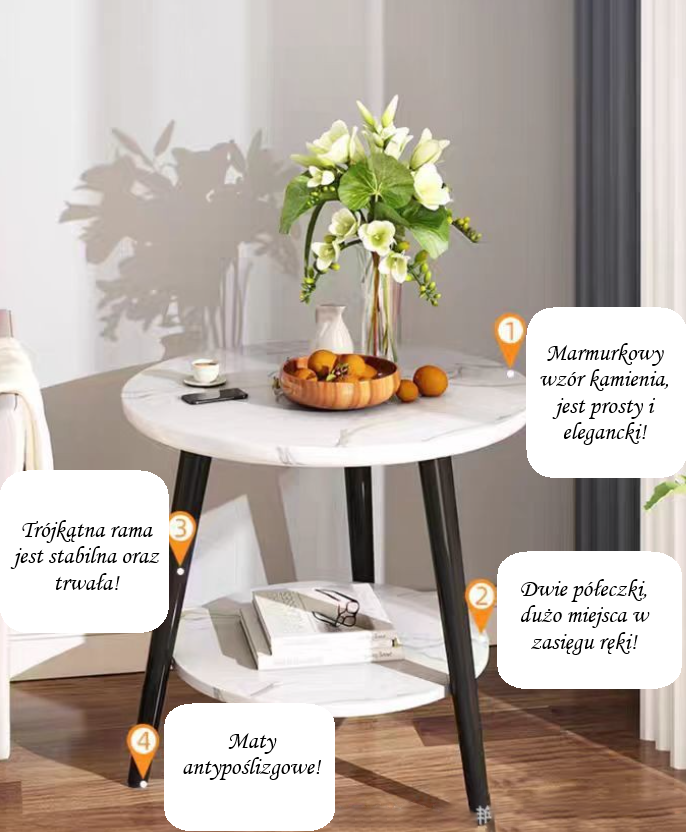 Stylowy i funkcjonalny stolik kawowy, który łączy elegancję marmuru z nowoczesnym designem. Idealnie sprawdzi się w salonie, sypialni czy gabinecie jako stolik pomocniczy, kawowy lub dekoracyjny.