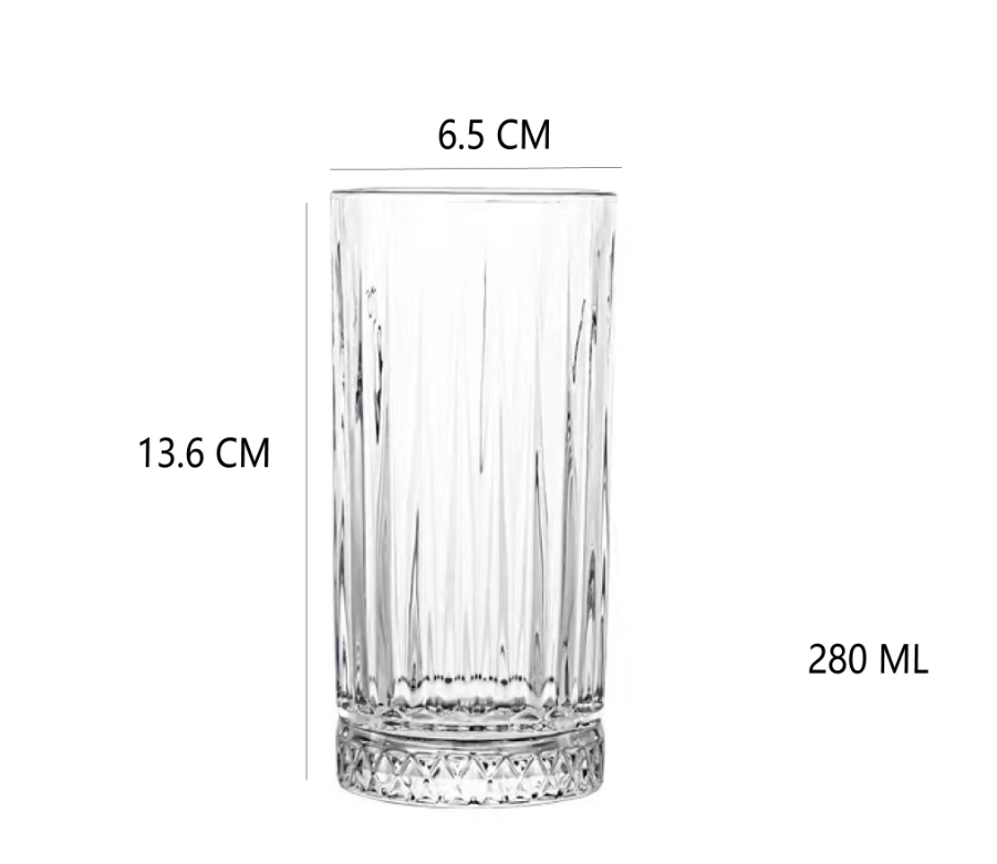 Komplet eleganckich szklanek wykonanych z wysokiej jakości szkła, zdobionych subtelnym, pionowym wzorem. Idealne do serwowania drinków, soków, koktajli czy wody. Smukły kształt oraz ozdobne dno nadają im stylowego charakteru, który świetnie sprawdzi się zarówno w codziennym użytku, jak i podczas przyjęć.