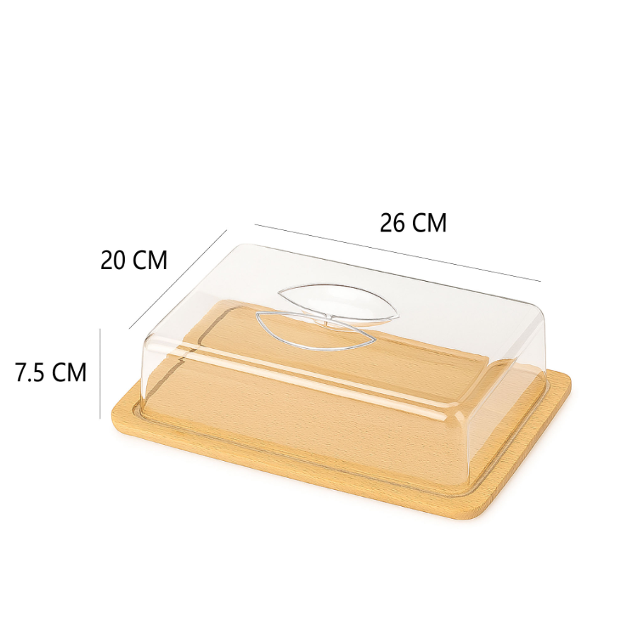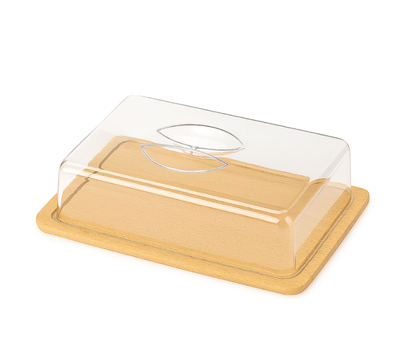 Zgrabna prostokątna taca z przezroczystą pokrywą. Chroni wypieki przed wysychaniem i owadami, a przy tym ładnie je eksponuje na stole.