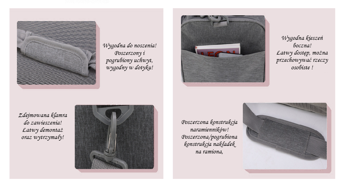 - Możliwość przypięcia torby pasem bezpieczeństwa w samochodzie – dodatkowa ochrona w trakcie jazdy.