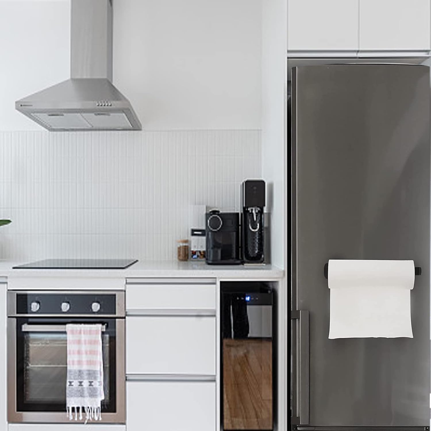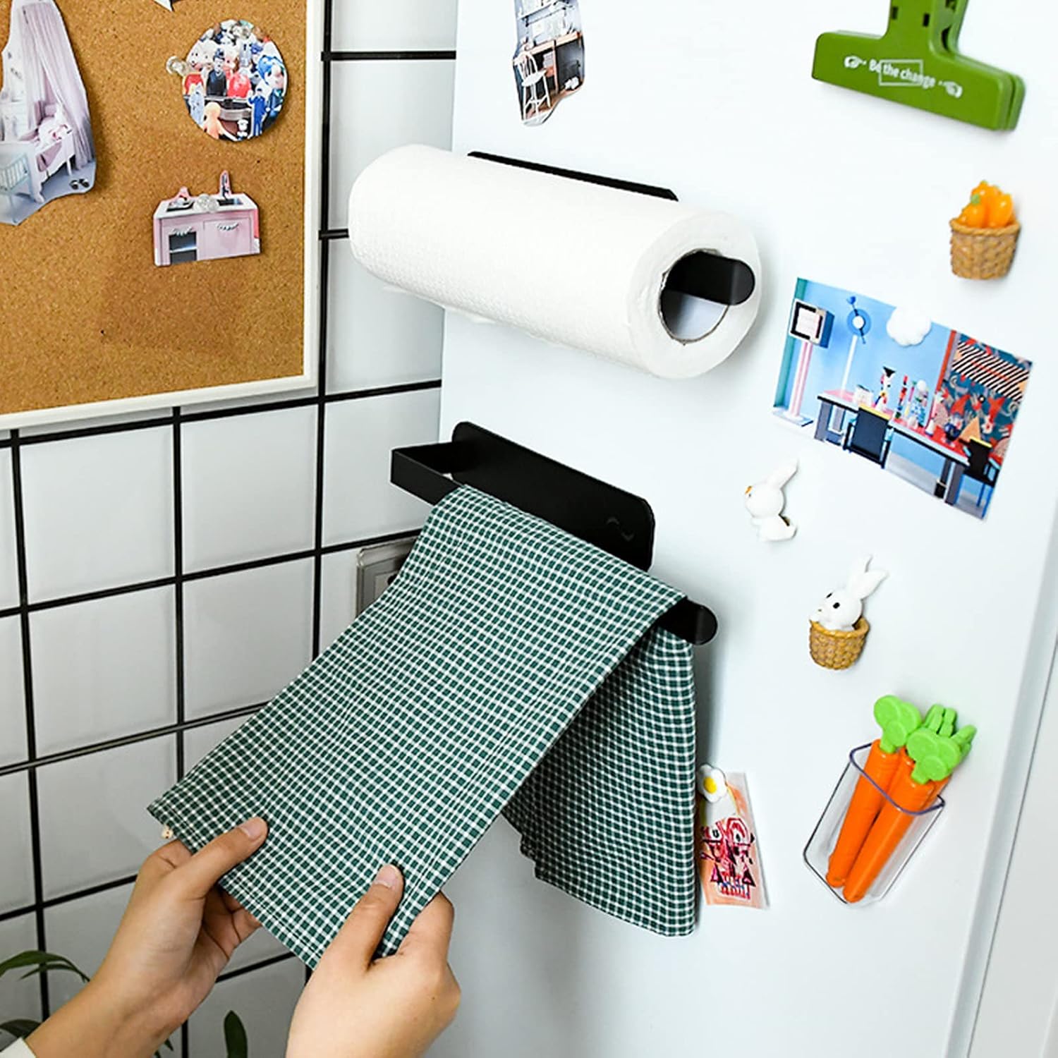 Stylowy i praktyczny uchwyt, który nie wymaga wiercenia – wystarczy go przymocować do metalowej powierzchni, np. lodówki, szafki czy mikrofalówki.