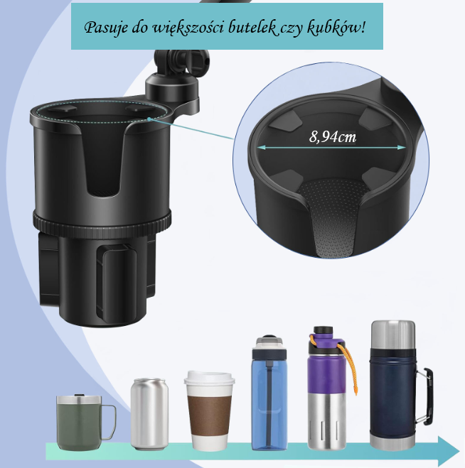 - Łatwa instalacja – wkładany w standardowy uchwyt na napoje w samochodzie (regulacja od 6,4 do 10 cm).