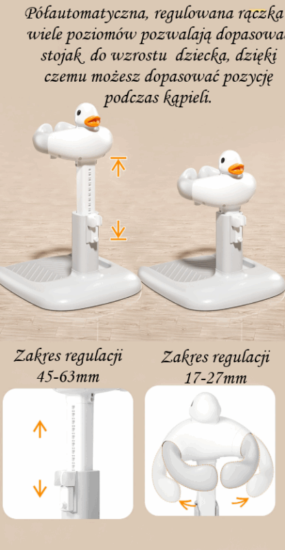 Uchwyt do kąpieli to praktyczne rozwiązanie, które ułatwia mycie dziecka pod prysznicem. Stabilna podstawa i regulowana rączka w kształcie kaczuszki pozwalają na dopasowanie stojaka do wzrostu malucha, dzięki czemu kąpiel staje się wygodniejsza i bezpieczniejsza.
