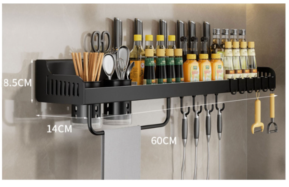 Półka może służyć do przechowywania drobnych przedmiotów, tkaj. noży, łyżek, przyborów do gotowania. Posiada też drążek na którym można zawieźć ściereczkę. Wymiary wieszaka 60x14x8,5cm! KOLOR CZARNY !