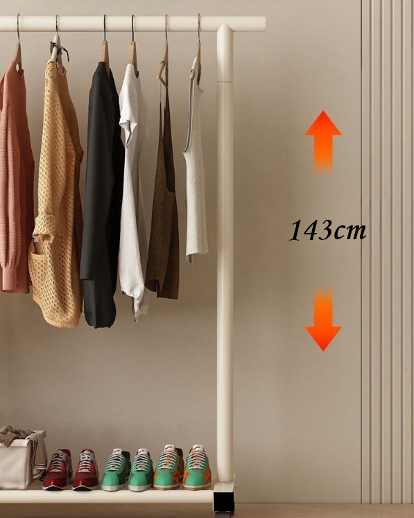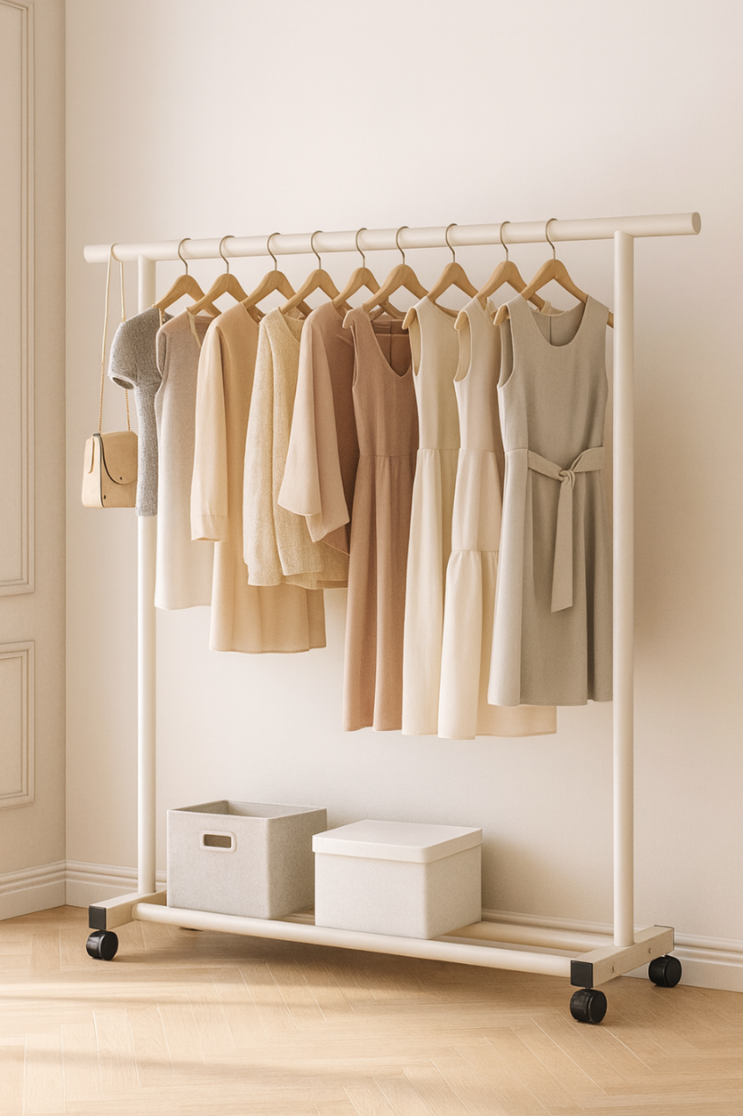 Praktyczny wieszak na ubrania w eleganckim, kremowym kolorze. Sprawdza się w sypialni, garderobie, przedpokoju, a nawet w sklepie. Jest lekki, a mimo to stabilny, więc bez problemu utrzyma codzienną odzież, płaszcze, sukienki czy dłuższe elementy. Dzięki kółkom możesz go przesunąć w dowolne miejsce bez wysiłku.