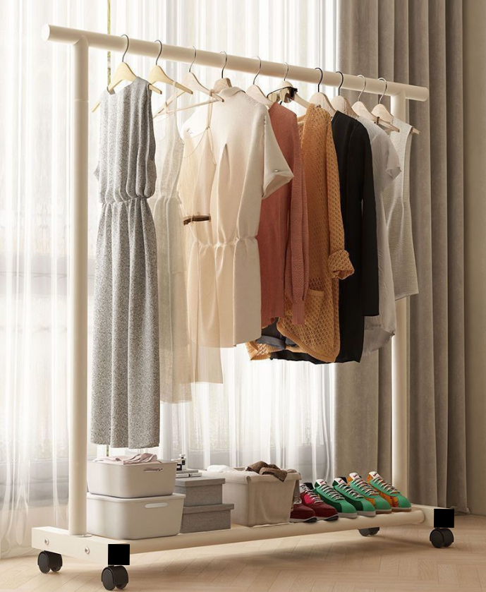 Praktyczny wieszak na ubrania w eleganckim, kremowym kolorze. Sprawdza się w sypialni, garderobie, przedpokoju, a nawet w sklepie. Jest lekki, a mimo to stabilny, więc bez problemu utrzyma codzienną odzież, płaszcze, sukienki czy dłuższe elementy. Dzięki kółkom możesz go przesunąć w dowolne miejsce bez wysiłku.