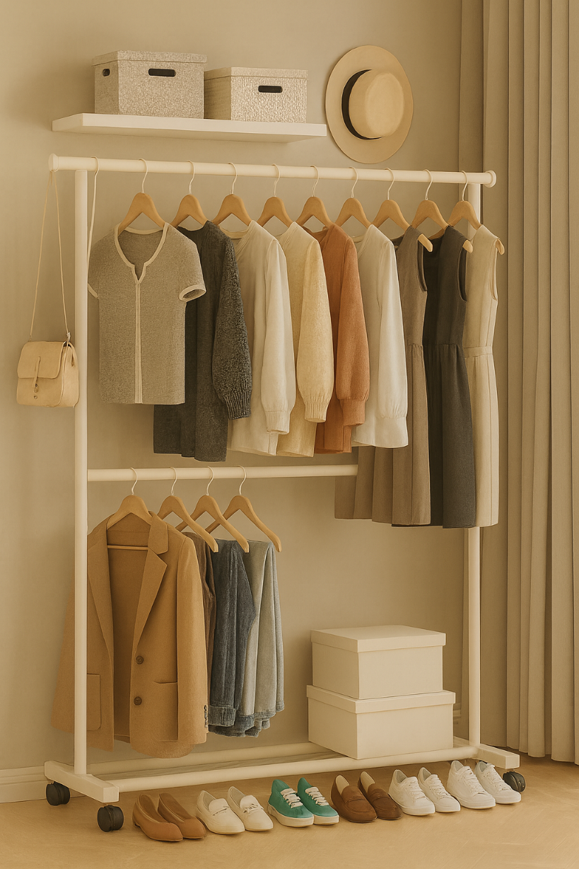 Wieszak ma kółka, więc łatwo go przesunąć, nawet kiedy jest pełny. Pod spodem zostaje jeszcze przestrzeń na pudełka, kosze lub buty – często robi to większą różnicę, niż się wydaje.
