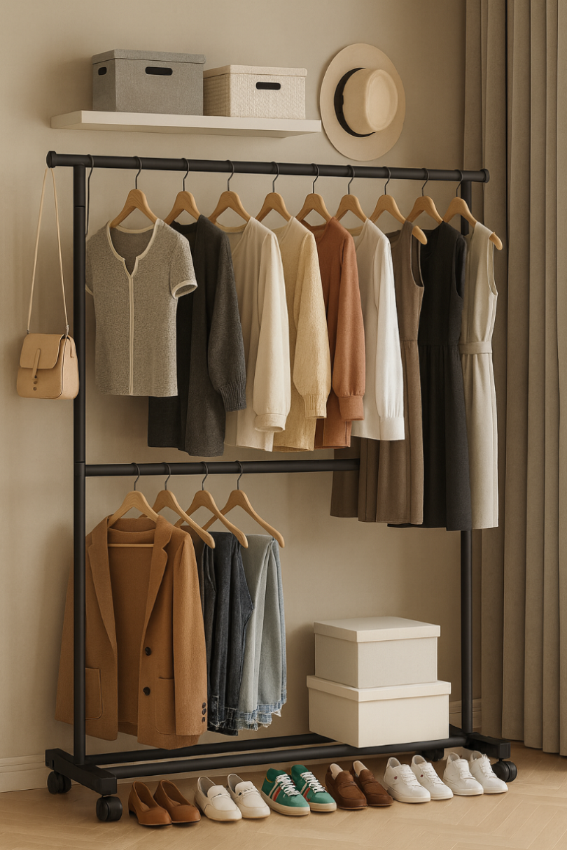 Wieszak ma kółka, więc łatwo go przesunąć, nawet kiedy jest pełny. Pod spodem zostaje jeszcze przestrzeń na pudełka, kosze lub buty – często robi to większą różnicę, niż się wydaje.