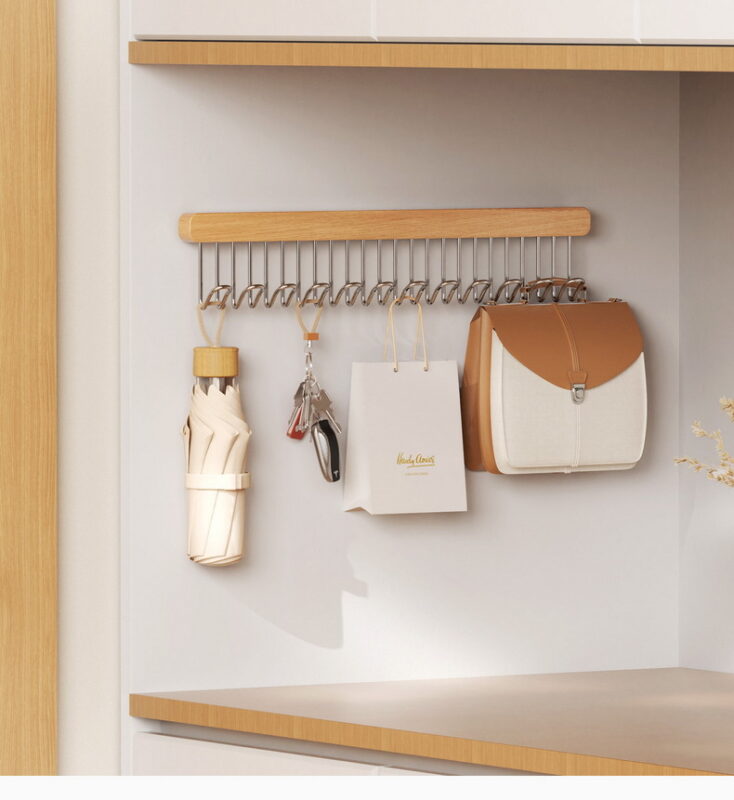 Zorganizuj swoją szafę z głową! Ten solidny, wysuwany wieszak z drewnianym uchwytem i metalowymi haczykami pozwala na wygodne zawieszanie ubrań, torebek, pasków czy akcesoriów – bez bałaganu i z łatwym dostępem do wszystkiego.