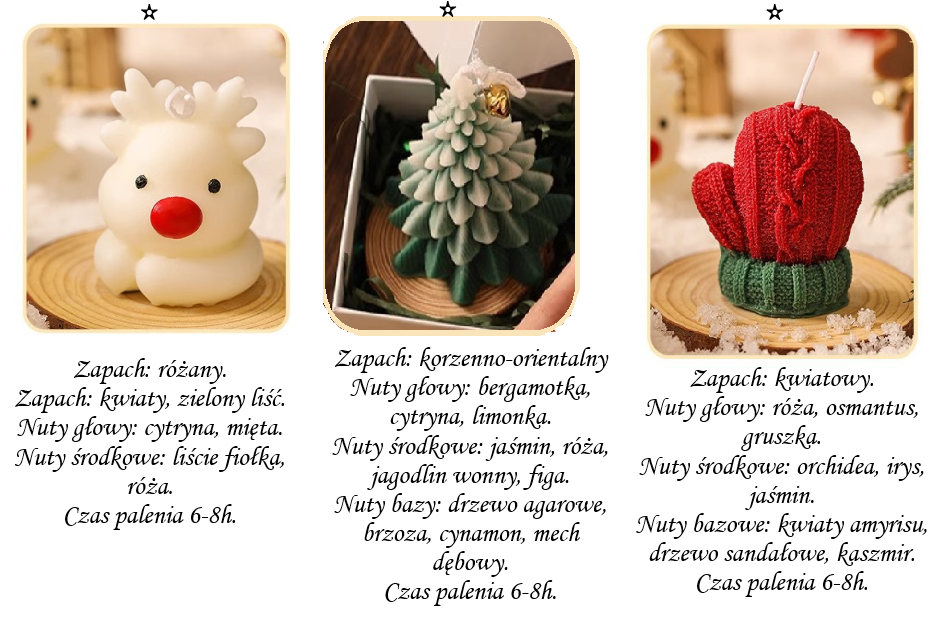 • Świeca choinka – klasyczna ozdoba świątecznego stołu. Zapach korzenno-orientalny z nutami bergamotki, cytryny i limonki. W sercu jaśmin, róża, jagodlin wonny i figa. Bazę stanowi drzewo agarowe, cynamon, brzoza i mech dębowy.